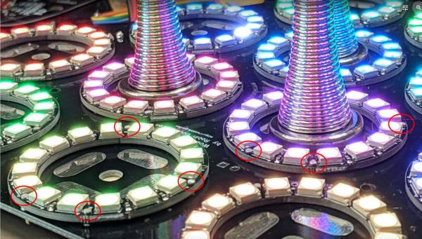 First, you will need to figure out which LED ring needs to be replaced. On each printed circuit board (PCB), there are 12 LED rings, which are connected in series. If an LED fails, all subsequent LEDs and rings on that PCB will be off or flicker. So you want to replace the LED ring where the first faulty LED is. This is most easy to see if the fault occurs halfway through a ring: