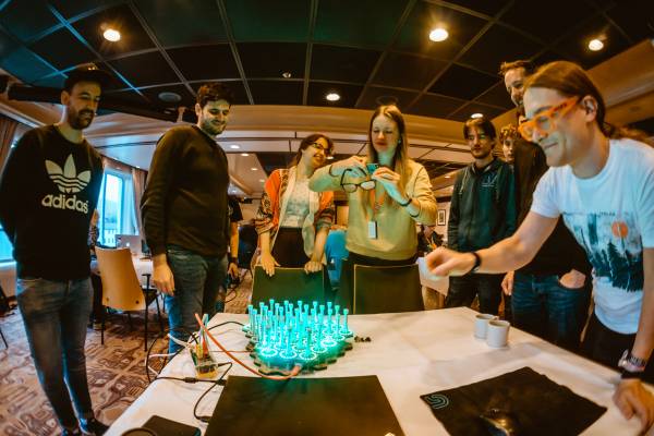 An installation of Wobble Garden consists of two parts: The spring controller and a PC processing the input and generating the output that is shown on the LED rings. Connection between the two is currently made using a USB cable, but that might change to a network connection in later prototypes.